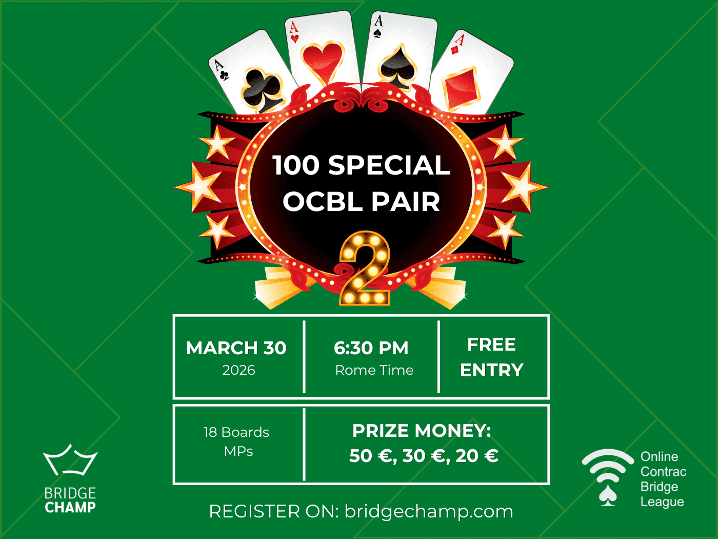 Join us on March 30, 2026, at 6:30 PM Rome Time for the 2nd 100 SPECIAL OCBL PAIR Event going LIVE on Bridge Champ. Top players, including our ambassadors Manno & Di Franco, will compete over 18 boards for an amazing prize. Register now at this free-entry event, and see you at the tables!